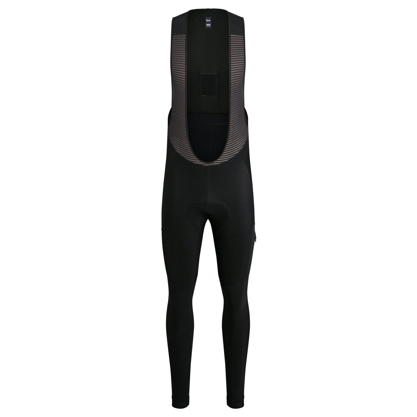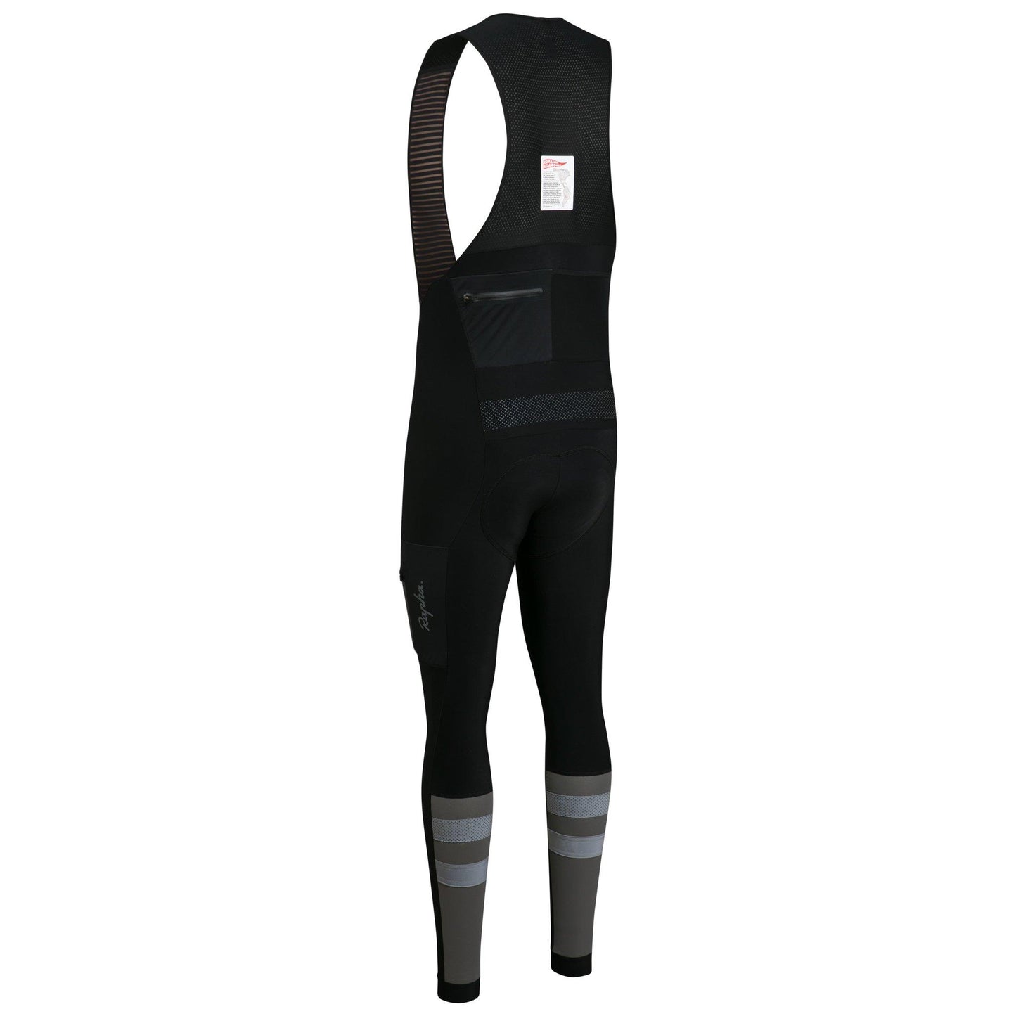 Rapha's Mens Cargo Winter Tights With Pad are made from a fleece-backed fabric with a durable water repellent treatment, the tights are warm and shed water in all but concerted downpours. The redesigned calf section is made entirely of a highly reflective material printed with distinctive stripes. The continuous movement of this part of the body coupled with a reflective stripe at eye level drastically improves a rider’s visibility in low light conditions. For immediate access to essentials on the move, two pairs of pockets feature on the outside of the upper legs and on the lower back section. Those on the left hand side are made of a water-resistant fabric and feature a zipper for security, those on the right feature a mesh material with excellent stretch for extra capacity. Reflective logos on the leg pockets provide an additional hi-vis element.