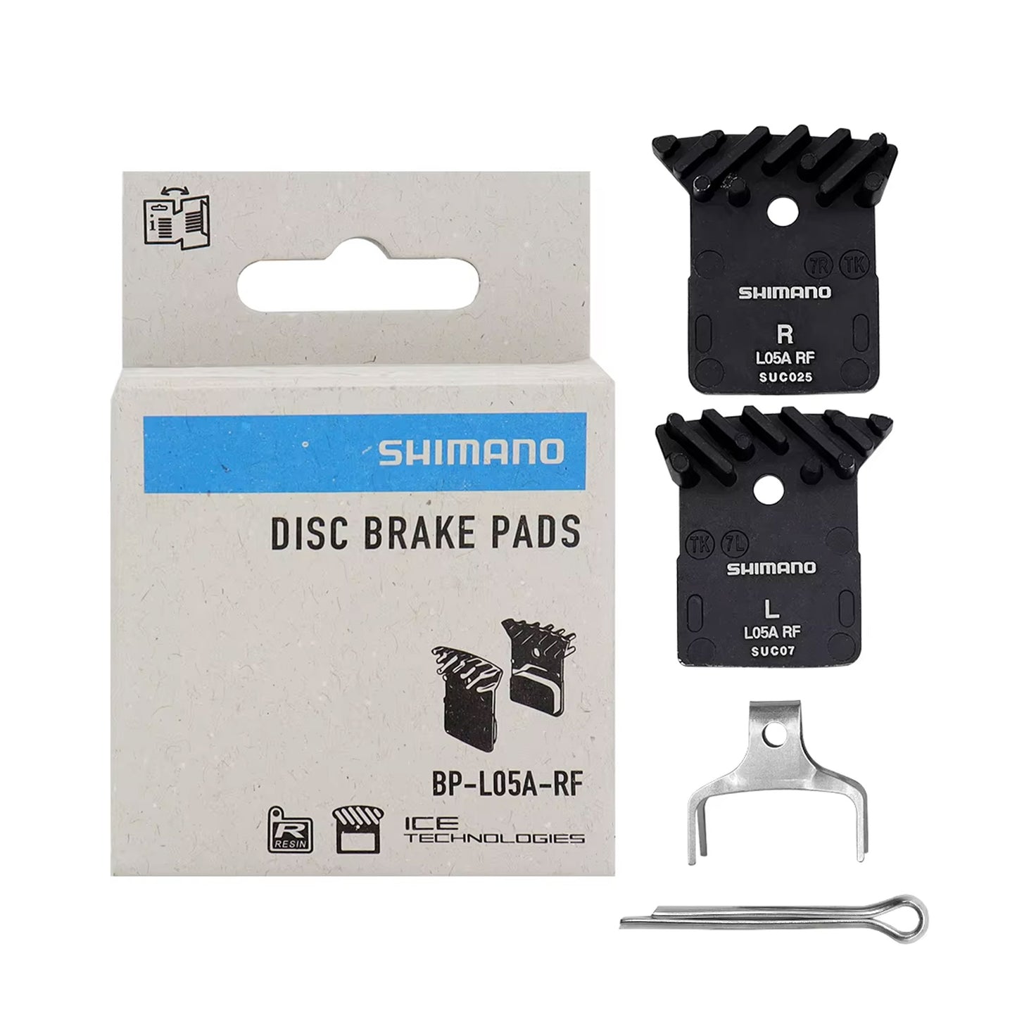 Genuine Shimano BP L05A-RF Resin Brake Pads With Fins and new spring perform well in all conditions, are fade-resistant, produce minimal noise, and have a longer pad life than their competitors. These Shimano L05A-RF Resin Pads w/Fins replace L03A Pads. They are suitable for Dura Ace, Ultegra, 105 and GRX 2-piston flat-mount disc brakes.